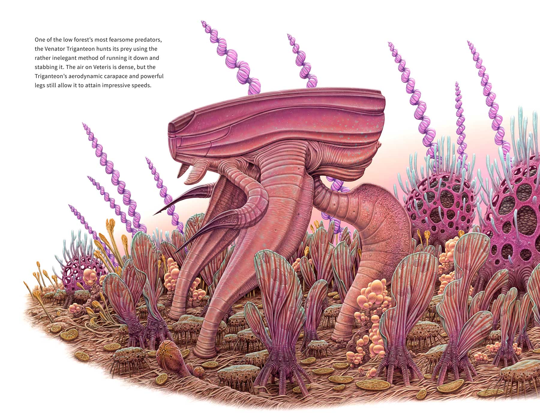 One of the low forest’s most fearsome predators, the Venator Triganteon hunts its prey using the rather inelegant method of running it down and stabbing it. The air on Veteris is dense, but the Triganteon’s aerodynamic carapace and powerful legs still allow it to attain impressive speeds. A large variety of other creatures here employ their own unique strategies to harness energy from the sun while resisting being covered by the ubiquitous tube carpet below.
