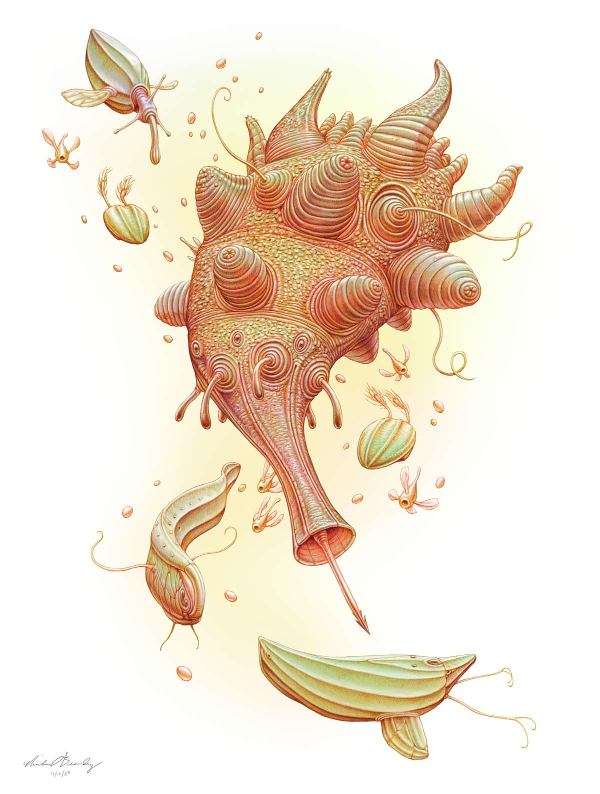 In the waters of a lowland swamp, a dramatic scene unfolds in miniature. The skeletal remains of a long-deceased creature have been colonized by a gelatinous, rather fluffy organism known as Rugosa. Covering any available real estate like a crumpled, spreading blanket, this filter feeder removes organic particulates from the surrounding water. Swamps with high levels of Rugosa growth maintain a more transparent water column, hosting more autotrophs and greater biodiversity. Firmly attached to this ensconced matrix is the decaying husk of a once mobile Flame Diversoma. Its last dying act was to serve as a shelter for its numerous offspring, which are now developed enough to disperse en masse. The coordinated timing of this exodus is critical, for a slow diffusion of these larvae would make them easy prey for the surrounding cadre of predators, who have gathered in anticipation of this event. The most successful hunter thus far is the Spotted Spearmouth, which relies on its harpoon-like proboscis to stab the passing swimmers and drag them into its maw. A vast swarm of semi-transparent Swamp Pearls paddles along slowly, unaware of the violence unfolding nearby. Having little in the way of visual sensors or situational awareness, their lives are consumed by chasing the flow of nutrients and favorable conditions in this tangled aquatic realm.