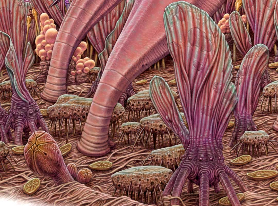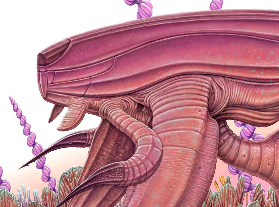 Like a giant pink warship, the Rosy Frigate punctuates the endless sea of tendrils. It hosts a crew of disk-shaped ravenous eating-machines called orbics. It is the orbics’ duty to keep the creeping tendrils from strangling and overtaking their home. Fading daylight signals their departure from the safe cluster beneath their giant companion to begin the night’s work of clearing new growth in the near vicinity. Each orbic can consume half its body weight in tube-carpet flesh every night, ensuring they will always have a place to return to at dawn. A Dwarf Blue Cortina observes the melee in confusion. Anything larger than an orbic will send it leaping away for cover, as its curiosity is matched only by its caution. The stoic quartet of Reponos standing solemnly in the background is incapable of seeing or hearing the events taking place nearby. Their role in this ecosystem turns out to be rather bizarre.