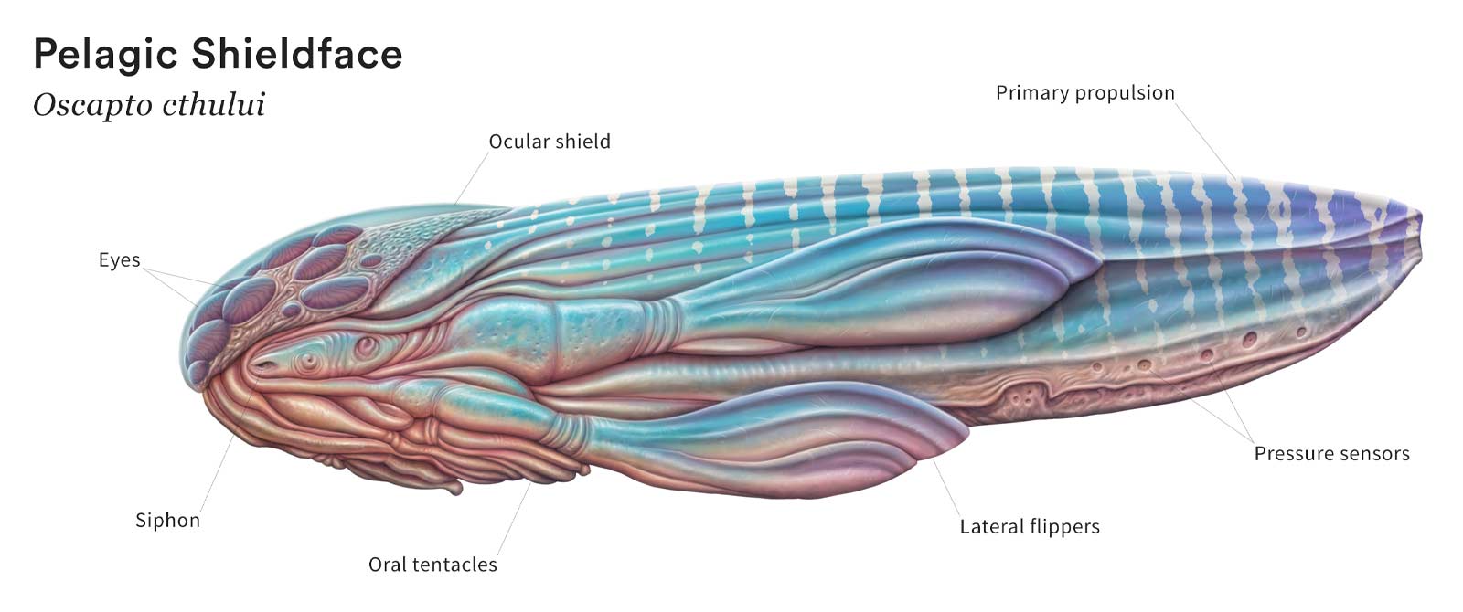 Adapted to develop inside a wide variety of pelagic creatures, the young grow internally - and sometimes even on the surface of - their hosts until such time as they detach and sink back into the darkness. For most host species, this seems to be a mutually-beneficial symbiosis. At the beginning they receive a large and valuable meal, and usually incur very little detriment from their temporary parasites. The young behemoths will hide in the dark depths for many years until attaining the size necessary to return to the light and repeat the ancient cycle again.